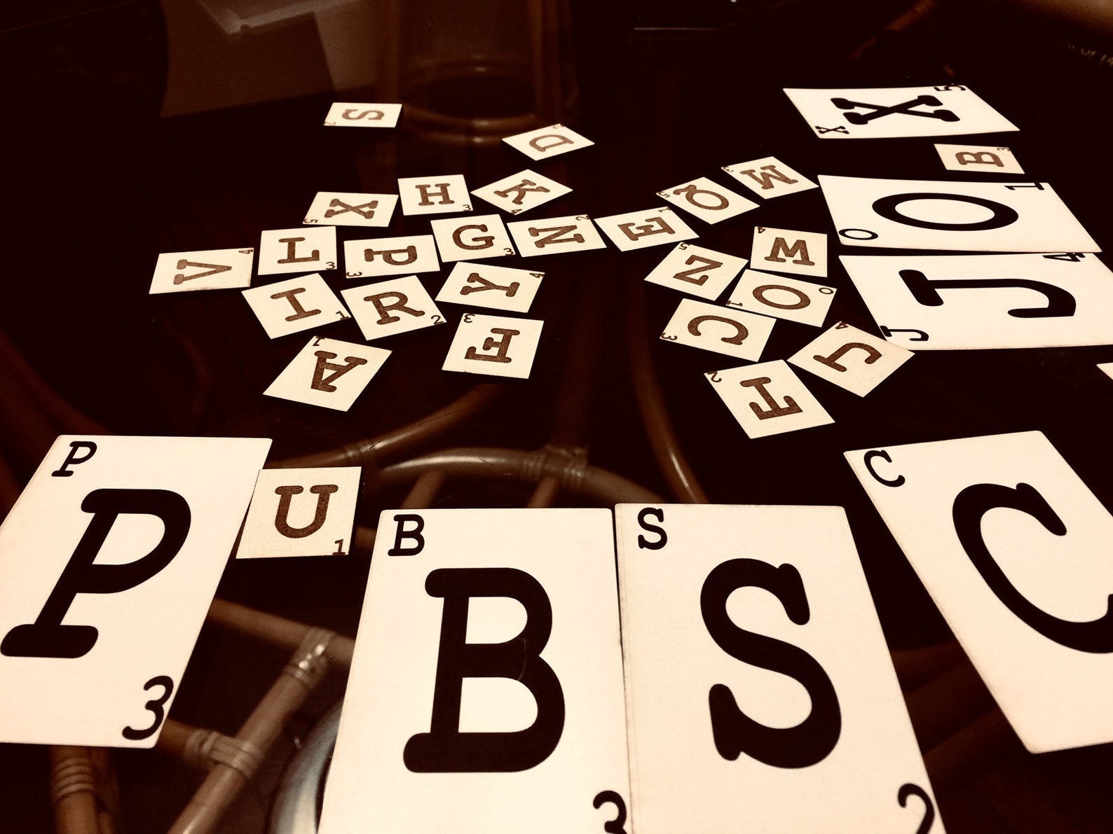 Setup: At the start of each round, randomly scatter all the letter tiles face up between the players. Shuffle the cards and place face down in a draw pile. Designate a scorekeeper and a end-of-game target score, for example, 100 points.